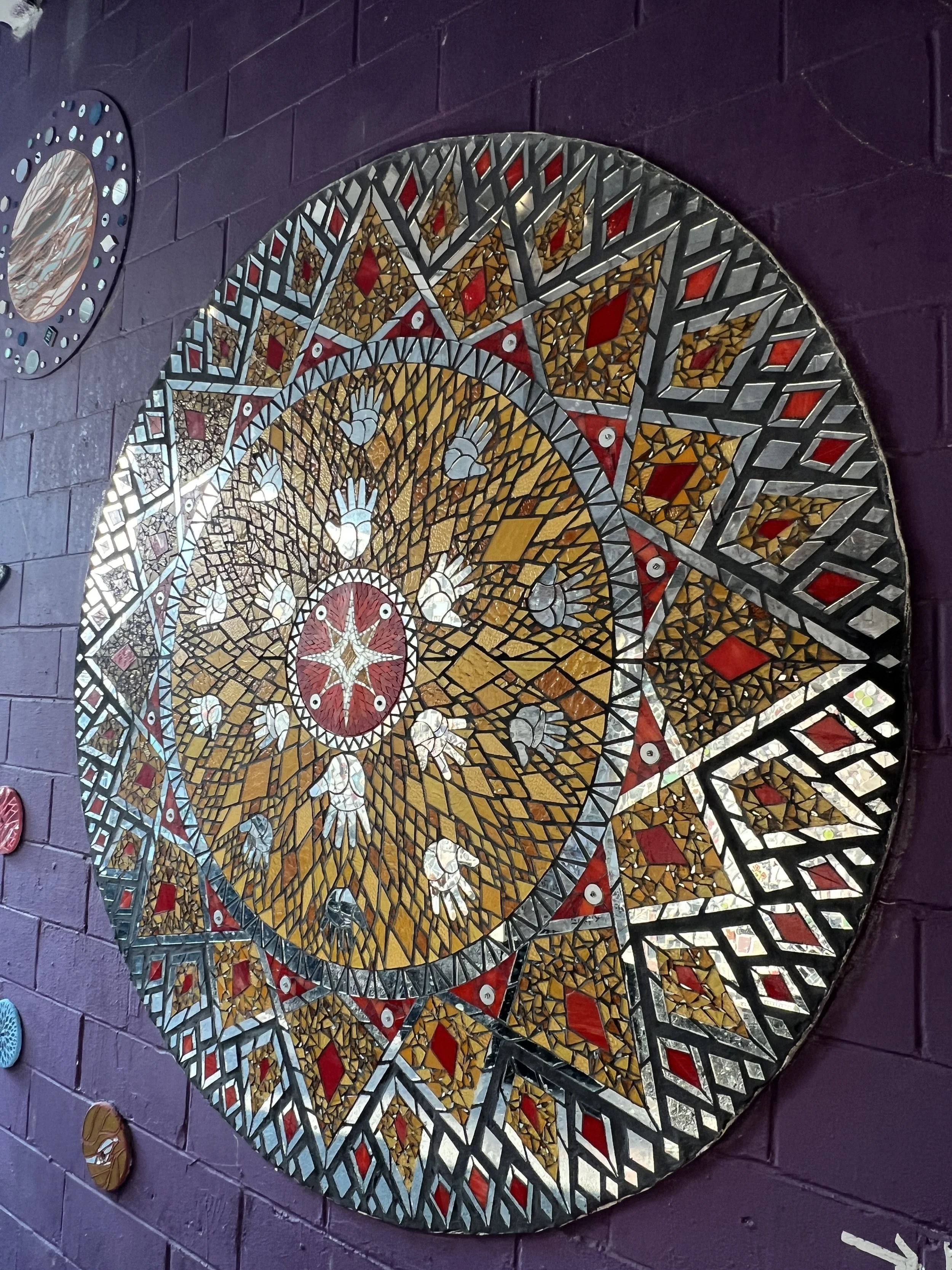 Description: Mosaic mural of a sun with handprints of local children from art workshops. The "Hands of the Sun" concept incorporates handprints made into mirrors to reflect the power of youth