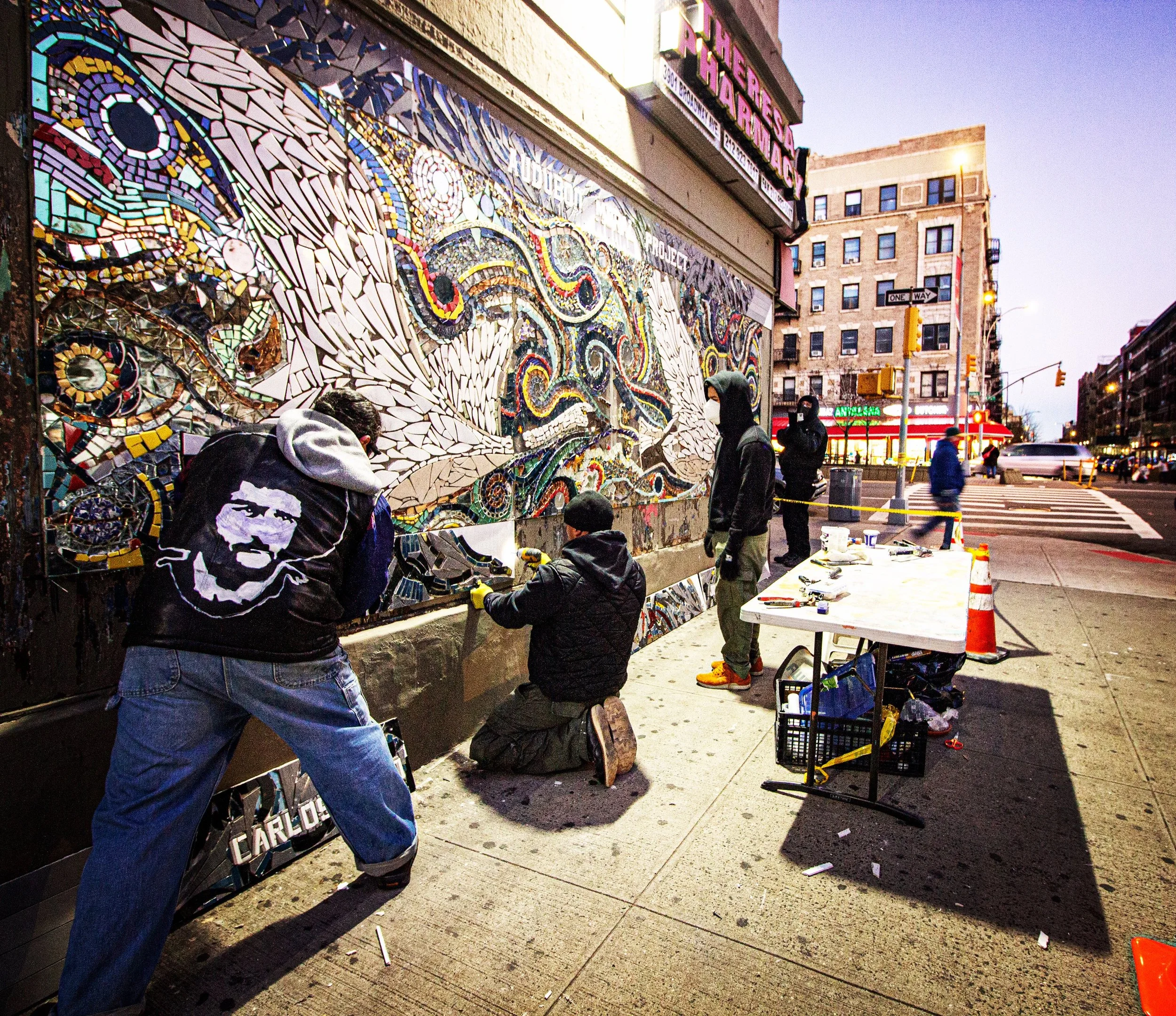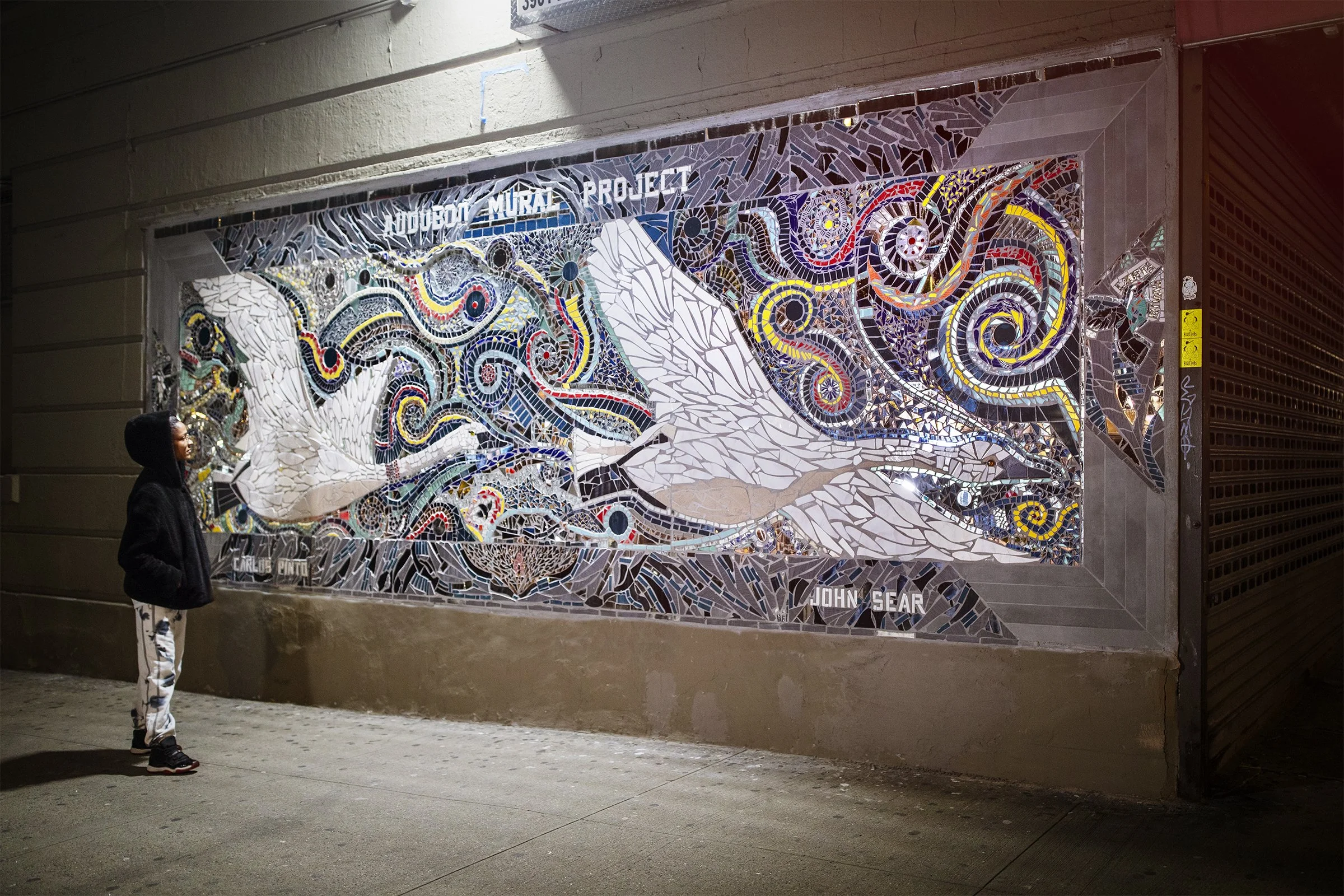 Description: Mosaic mural depicting two 9 foot flying trumpeter swans